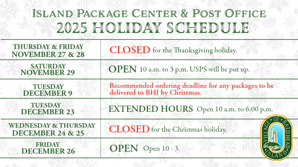 First-Class Mail for Non-PO Box Holders – Residents who do not have a PO Box can collect first-class mail at the Island Package Center counter. The IPC/PO holds this mail for only TWO WEEKS. After that time, it will be returned to the sender. If you have been receiving mail at the IPC/PO for your BHI address, please pick it up in a timely manner so that it does not get sent back.