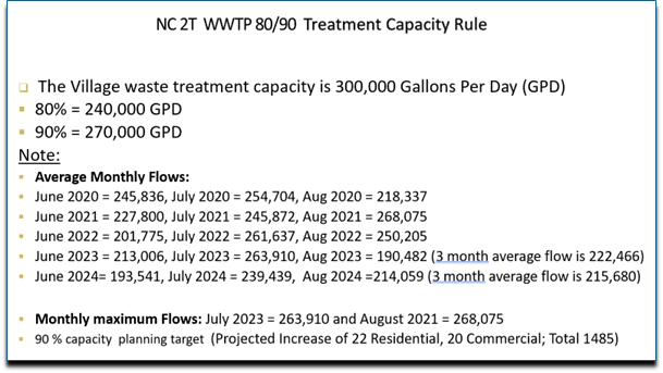 - Prior to exceeding 90 percent capacity, a utility shall obtain all permits needed for the expansion of the wastewater treatment plant, utilization, or disposal system and submit final plans, specifications, and a State approval permitting letter to proceed for the WWTP expansion, including a construction contract. The Village’s permit package was to be submitted at the end of November 2025. If these required actions are not taken when a utility reaches capacity, a moratorium on sewer line extensions shall be imposed by the NC Department of Environmental Quality (DEQ), which means no new homes will be built.