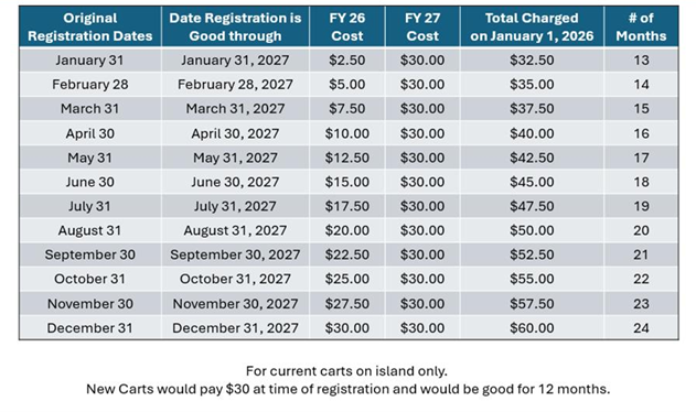 A: The explanation letter that came with your invitation indicates that cart owners will be paying to renew their carts through 2027. 2026 is prorated based on the original registration date of each cart. So, you are getting charged the full $30 for both carts for 2027 and then a prorated amount for each cart based on when they were originally registered. If your carts were registered at different times, the amounts will differ. (Added 12/16/2025 – 9:45 a.m.)