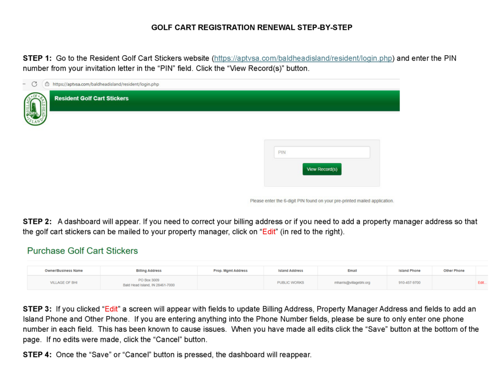 Currently, only registration renewals are being processed. If you are a new property owner who has not previously registered golf carts on BHI, you cannot register at this time. When the Village begins issuing new registration PINs, Islanders will be notified via the Village’s Voice, and instructions will appear on this website. In the meantime, you may request a new registration PIN by emailing golfcart@villagebhi.org.