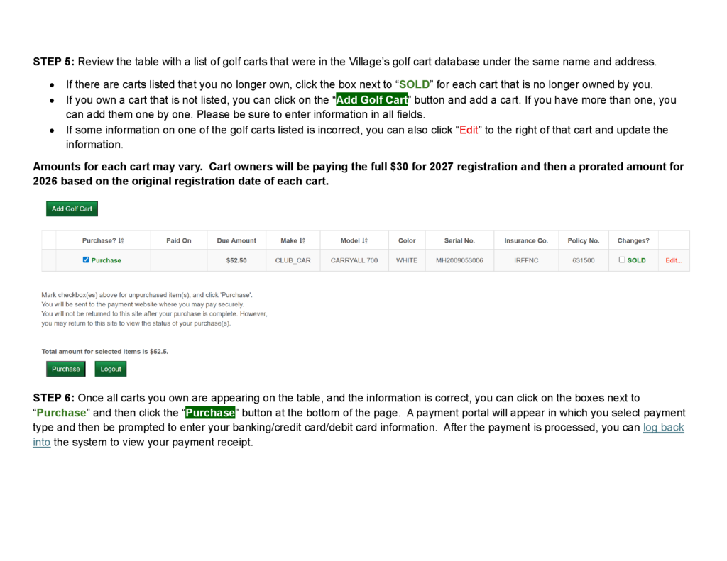 The registration invitation included a list of the registered carts under the same name and mailing address. A website link (LINK) was provided where owners are to log in with a unique registration pin. Cart owners can view step-by-step instructions HERE (or at the bottom of this webpage).