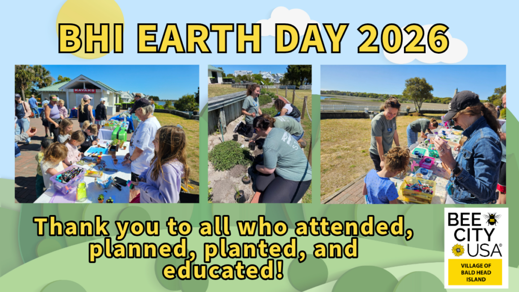 BHI held its annual Earth Day Festival at Marina Park on Friday, April 10th. There were over 130 participants, and several organizations participated.  Many thanks to Heather Bariso at the BHI Conservancy for organizing the event and Betsi Stephen for her assistance and presence at the Bee City USA booth.  In addition to the various organizations that provide educational material (Museum of Coastal Carolina, Brunswick County Soil and Water Conservation, N.C. Cooperative Extension, Sandbar Oyster Company, etc.) there were new plants to be installed in the pollinator garden. Ms. Stephen was pleased to report at the 4/17 Council Meeting that those plants were made possible by a grant from the Georgetown University Retired Faculty Fund, which granted a sizeable amount of funds for the spring planting of the garden. Fifty grant-funded plants were planted thanks to the help of BHI Conservancy staff.